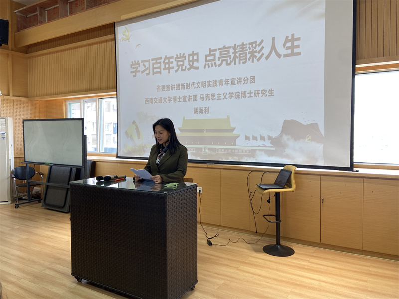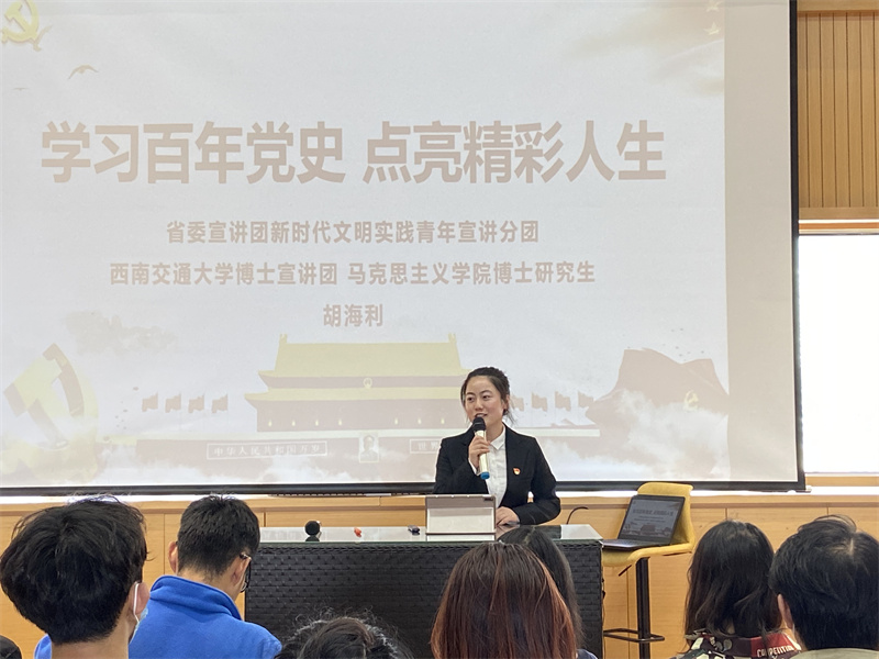 4月27日,为深入学习贯彻习近平总书记在党史学习教育动员大会上的重要讲话精神,引导广大学生树牢唯物史观,筑牢信仰之基,传承红色基因,砥砺政治品格,音教学院党总支、学生党支部、分团委 今天在这里举行主题为“学习百年党史、点亮精彩人生”的五四青年节大会。此活动有幸邀请到四川省党史学习教育宣讲团新时代文明实践青年宣讲分团成员、西南交通大学博士宣讲团成员、西南交通大学马克思主义学院马克思主义理论专业博士研究生胡海利为大家做主题宣讲。参加活动人员包括分团委学生会干部、学生党员代表和普通学生代表60多人参加。