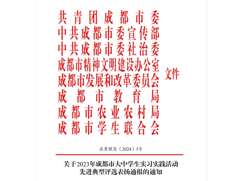 为深入学习贯彻党的二十大精神,落实习近平总书记关于青年工作的重要思想,教育引领全市青年学生在实习实践中增强责任感和使命感,以实际行动走进城乡基层,自觉融入到成都的发展建设中,团市委、市委宣传部、市委社治委、市文明办、市发改委、市教育局、市农业农村局、市学联号召全市大中学生深入基层围绕重点方向开展各类社会实践活动。beat365在线唯一官网音乐教育学院积极响应号召,并在2023年成都市大中学生实习实践中被评为先进单位。