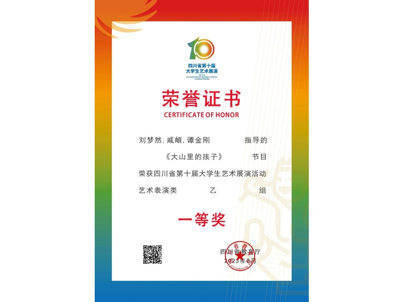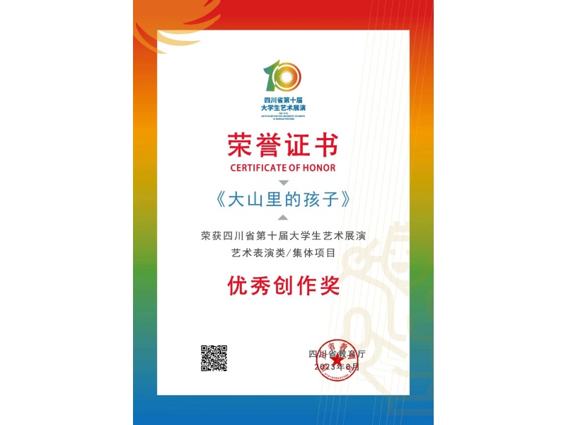 2023年8月22日,由四川省教育厅主办、成都师范学院承办、温江区人民政府协办的四川省第十届大学生艺术展演活动在成都师范学院隆重举行,来自全省134所高校的艺术节目进行了集中展演。由我院选送的原创合唱作品《大山里的孩子》在此次展演活动中荣获艺术表演类/集体项目优秀创作奖和艺术表演类乙组一等奖的佳绩。在此向我院参加展演的同学们及指导教师刘梦然、戚頔、谭金刚表示祝贺!