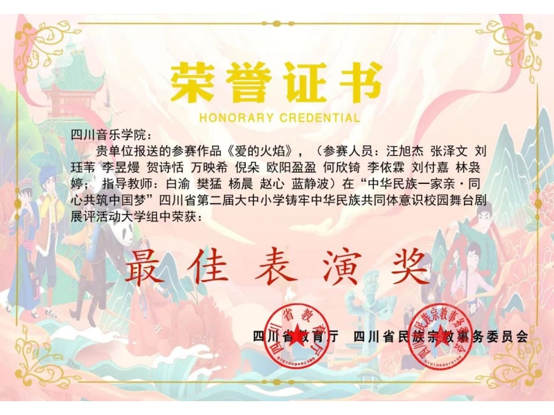 接到通知以来,我院高度重视,精心组织师生踊跃参与,推选了小音乐剧《爱的火焰》参与四川省第二届大中小学铸牢中华民族共同体意识校园舞台剧展评,荣获“二等奖”及“最佳表演奖”。该剧以大学生顶岗支教为背景创作,鼓励音乐教育师生更多投身支教事业,让支教工作走向社会,影响和号召更多的人加入支教的队伍,将这爱的火焰继续燃烧,助力教育振兴,为山区的留守儿童照亮前进的路,通向光明的未来。