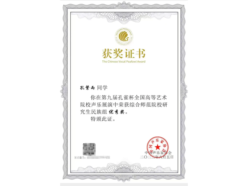 在第九届孔雀杯全国高等艺术院校声乐展演中,汪旭杰同学荣获综合师范院校本科生民族组银孔雀杯,刘梦瑶同学荣获综合师范院校研究生美声组铜孔雀杯,孔繁雨同学荣获研究生综合师范院校民族组优秀奖。热烈祝贺以上同学代表我院参加比赛荣获优异成绩!同时,也向他们的声乐指导老师:蓝静波、胡松、郭敏老师表示祝贺!