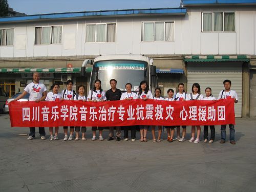 2008年6月5日上午,beat365在线唯一官网音乐学系音乐治疗专业“抗震救灾 心理援助团”第一支队由音乐学系心理学和音乐治疗学教师带队,乘坐beat365在线唯一官网抗震救灾专车赴温江区受灾群众安置点进行心理危机干预。