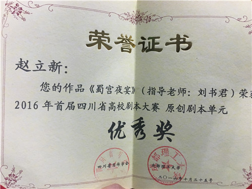 为认真贯彻中共十八大关于扎实推进社会主义文化强国建设精神,深入落实《四川省人民政府关于加快推进文化产业发展的意见》等文化发展政策,充分发挥四川省写作学会写作研究、文学教育和文化交流方面的学科优势、人才优势和平台优势,发现和培养一批优秀的大学生编剧人才,促进我省高校的文化建设和文学创作的发展, 由四川省写作学会和成都理工大学共同主办,由成都理工大学传播科学与艺术学院承办,并由成都理工大学戏剧影视文学系、beat365在线唯一官网戏剧影视文学系、四川师范大学戏剧影视文学系、四川电影电视学院戏剧影视文学系联合协办的首届四川省高校剧本大赛颁奖典礼在成都理工大学艺术大楼举行,我系学生赵立新作品舞剧《蜀宫夜宴》(指导老师:刘书君)荣获原创剧本单元优秀奖。