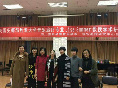 2016年12月5日下午,应beat365在线唯一官网音乐学系与音乐治疗研究中心邀请,美国安娜玛利亚大学音乐治疗专业教授、主任Lisa Summer博士在川音多功能厅为音乐治疗专业师生举行了《资源取向音乐治疗》的讲座和工作坊。