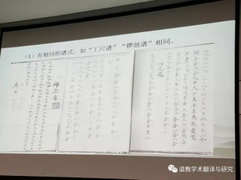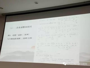 其次,介绍成都道教音乐与地方音乐之间存在的相似性关联。在这一部分中,甘教授选取了道教音乐和地方音乐中一些相似的曲谱,现场哼唱,以讲唱结合的方式逐个介绍了成都道教音乐与成都地区的戏曲音乐(川剧的昆腔和高腔)、曲艺音乐(竹琴和清唱)、佛教音乐(梵呗)、地方歌舞音乐(花灯和连厢)、民间器乐(器乐曲牌)等各类音乐之间的关联。