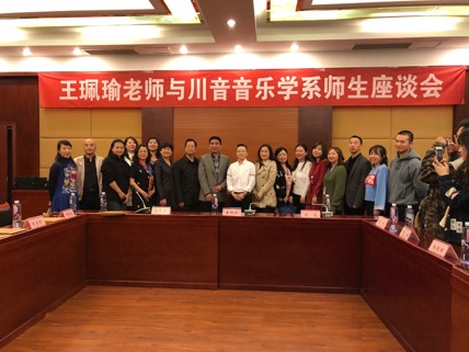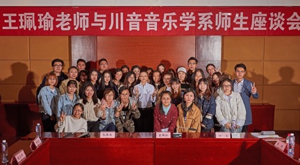 讲座结束后,王珮瑜到了川音梧桐楼三楼学术报告厅进行她川音之行的第二站——与音乐学系的师生们进行一次面对面的座谈。本次座谈会由音乐学系系主任、传媒学院院长包德述教授主持,音乐学系党总支书记何凌老师、音乐学系甘绍成教授、朱江书教授、杨晓教授、杨晓琴教授、朱婷副教授等教师出席了座谈。另有音乐学系研究生、本科生七十余名同学参与了本次座谈并与王珮瑜老师进行了深刻的交流。