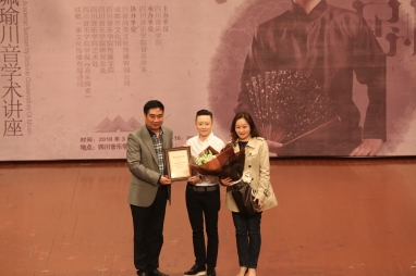 王珮瑜老师说:“我讲课的目的是为了让大家知道生活中还有京剧这样美好的存在”,而在场观众纷纷用喝彩和掌声回应了王珮瑜老师的期望。在讲座结束后,王珮瑜老师与全体观众合影留念。音乐学系系主任、传媒学院院长包德述教授与音乐学系党总支书记何凌老师为王珮瑜颁发纪念证书来感谢她为传统音乐的普及做出的巨大贡献。随后包德述教授表示,欢迎她再次前来为川音的师生们传授更多关于京剧的知识。