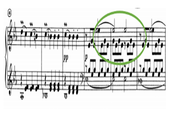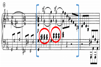另外,引子中的“不稳定”性涌动的情绪在呈示部后两次以打断的的形态出现(在展开发展部前与结尾的尾声段时),刘教授认为,如果从昆体良的修辞理论看,贝多芬让引子“出其不意”地重现,宛若演讲者在演讲的过程中想继续保持听众那已经在一开始就被点燃的情绪。刘教授认为,在稳定律动下的动机节奏是节制,调解或是压制汹涌情感的关键,它克服了伤感情绪在演讲过程中让演说者的性格失去稳定性。