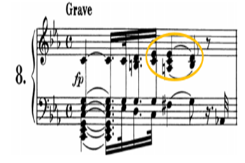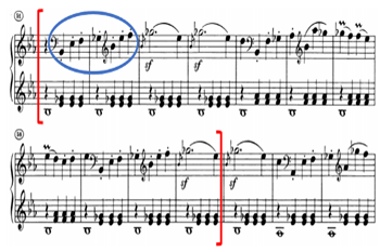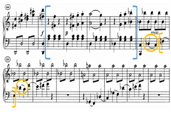 除此之外,“二元对立”(antithesis)也是一种伤感风格的重要修辞格,它不仅体现在引子/快板(呈示部)的并置中,并且也在局部的范畴中有着鲜明的表现,例如在引子中(谱例7)
