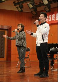 当主持人提问“传统戏曲和影视剧有哪些相同和不同之处,对您的演艺生涯有着怎样的影响呢?”时,杨老师回答“我从来不把传统和时尚、现代对立起来,他中有我,我中有他。我觉得现在的东西是不可能离开我们的传统,传统是基石。”她反复强调任何艺术都不能排他,无论是传统还是时尚,无论是中国戏曲还是西洋的歌剧,每一个领域都是一个博大的世界。“每一个艺术最本真的是表达,观众是否真情实意的接受,这些是需要我们去琢磨的,你不能孤芳自赏,不能孤立出去。”讲座过程中杨俊老师和曹祝来老师为我们现场展示了黄梅戏的精彩表演,其中包括了《天仙配》和《女驸马》中两个广为人知的经典唱段,让在座的师生们真切的感受到了黄梅戏的魅力,甚至情不自禁跟随唱段小声哼唱起来 。看着场下师生们跃跃欲试的表情,杨俊老师和曹祝来老师以《女驸马》中经典的《为救李郎离家园》唱段进行现场教学,邀请部分同学上台学习黄梅戏的演唱和身段。在教学过程中,台上的同学认真跟随杨俊老师学习专业的运腔吐字和优美的身段,台下的同学、老师也纷纷相随而动,台上台下一片活跃与欢快的气氛。