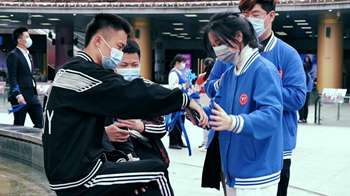 活动现场,音乐学系党员师生们身着统一的服装,为来往行人分发象征“关注”的蓝灯并为其系上象征“羁绊”的蓝色丝带。