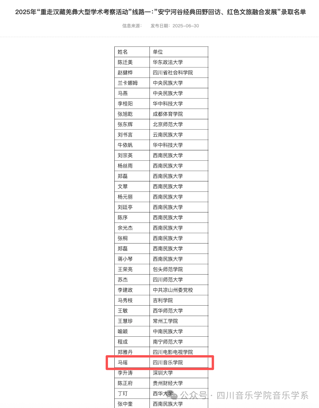 在学术探索与实践深耕的道路上,我系始终鼓励学生勇于创新,积极投身田野调查与学术交流。2025年暑期,我系2024级西南少数民族音乐研究专业硕士研究生马瑶同学在朱婷教授悉心指导下,先后入选两项国内高水平学术活动,充分展现了我系研究生培养的优势与办学实力。