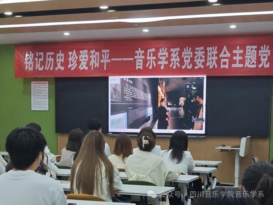 为深入学习领会习近平总书记在纪念中国人民抗日战争暨世界反法西斯战争胜利80周年活动上的重要讲话精神,弘扬抗战精神,传承红色文化,10月22日下午,我系党委组织党员师生以线上线下相结合的方式,在教学楼609室共同参与了“铭记历史、珍爱和平”联合主题党日暨千人同上一堂思政大课活动。此次活动由哈尔滨音乐学院党委组织部、宣传统战部、音乐学系党总支及侵华日军第七三一部队罪证陈列馆共同策划开展,汇聚了全国十余所专业音乐院校音乐学系(人文学院)和艺术院校音乐学院党委的千余名师生代表参加。