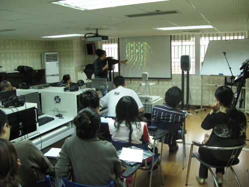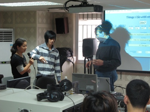 在琴房大楼音乐制作实验室中,Jeffrey Stolet教授以自己创作的交互式电子音乐作品“Thing do with my Fingers”为基础,讲授了利用Max/MSP/Jitter进行创作的技巧、方法,以及与视频结合的交互式电子音乐的创作思路。“Things I Do with my Fingers ”由任天堂wii的蓝牙无线感应控制器来共同完成的作品,包含了声音和视频的多媒体互动作品。