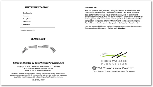 美国“Doug Wallace Percussion LLC.”举办的“Doug Wallace Percussion 2008”打击乐作品作曲比赛中的获奖作品已由 “Dong Wallace Percussion LLC.”在美国公开出版(包括总谱和分谱),其中包括打击乐合奏作品组第一名获得者——作曲系教师毛竹的作品《KOTEKAN——For percussion quartet》,乐谱的购买目录详见“Dong Wallace Percussion”官方主页:http://www.dougwallacepercussion.com/publications/2739.xml 作品《KOTEKAN——For percussion quartet》的音响资料将收录进作曲系主页的“视听展示”。