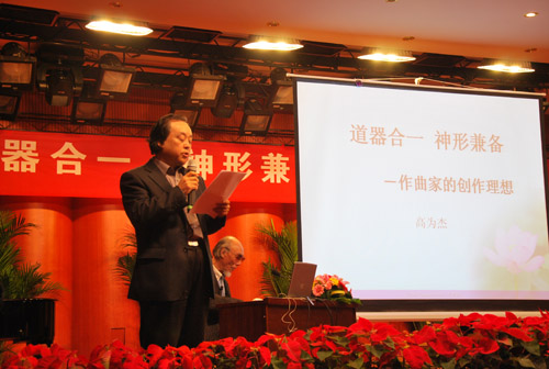 2009年10月12日,建校70周年的一系列庆祝和学术交流活动正式拉开帷幕,作曲系的开场就是著名作曲家高为杰先生以“道器合一,神形兼备”为题的讲座。 下午2点半,高为杰先生准时出现在了新教学楼的聂耳音乐厅,在高先生谦逊的介绍中。讲座在一片轻松愉悦的气氛中开始.讲座历时2个半小时,内容丰富,条理清晰又不失轻松幽默。整个讲座大致分为四个部分,每一个部分都紧扣题目。 首先,高先生为讲座破题,用短小精悍的八个字概括了作曲家的创作理想,并细致地作出了剖析。器为道用,形为神纲,且器与形本身也具有独立的美学价值。紧接着,高先生讲述了为了达到这个理想所有的作曲者将如何做出努力——通过分析经典作品来学习作曲。通过实例具体讲述了如何逆向还原作曲家创作乐曲时的思维活动及步骤,关注风格形成的关键,并兼收并蓄,形成自己的方法,达到自己的艺术表现目的。 此外,高先生跟同学们分享了自己的作品,及具体的经验,从实践地角度紧扣主题进行阐述。 最后,高先生回答了同学们提出的各种疑问,同学们在此次讲座中受益匪浅。