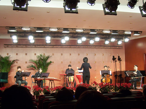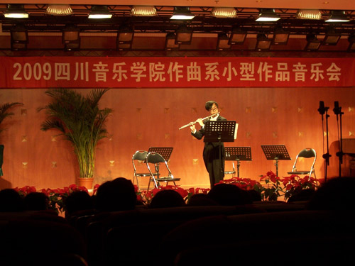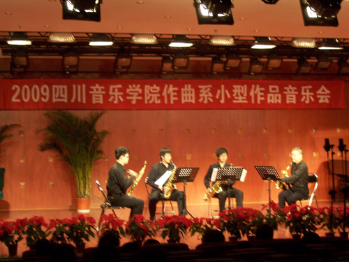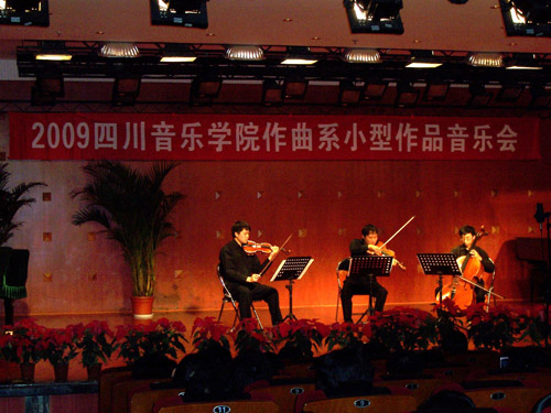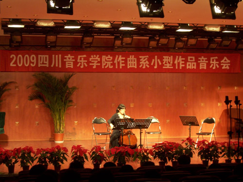 在我院的70周年院庆之际,我院作曲系2009年10月14日下午3点在星海音乐厅举行了系列音乐会之一 – 作曲系小型作品专场音乐会。音乐会上演了我系老师和学生近几年创作的作品。上演的作品有大提琴独奏、弦乐四重奏、弦乐三重奏、钢琴独奏、萨克斯四重奏、声乐、民族室内乐,还有手风琴与多媒体等。在中场休息时,观众相继参观了我系青年教师白小墨设计的电子音乐系统。 除了作曲系师生、其它系同学前来欣赏,受邀来参加院庆的校友及外教来宾也纷纷到场观赏。