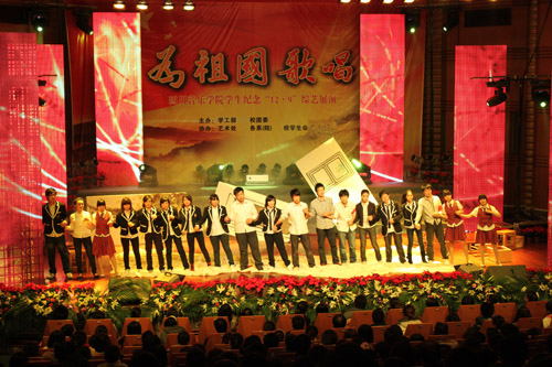 为迎接12.9学生运动纪念日,作曲系09级的同学们原创排演了一出音乐小品—《我们永远在一起》。 剧情故事发生在2008年5月12日四川汶川大地震当天,同班的一群同学正在为一次演艺活动而准备节目。男同学与女同学各出一个,但只有其中一个能选中被演出。可是男女双方都想让自己的节目出演,从而引发了男女生间发生矛盾。就在双方比赛看谁的节目更好时,5.12大地震发生了!教学楼发生坍塌,部分同学被埋于废墟之下。在这危难的时刻,同学们抛弃了之前的矛盾与偏见,重新团结起来,奋不顾身自救救人。同时,在党中央的领导指挥下,各地解放军和志愿者也加入到救灾行列中。 全剧体现了同学们危难时刻见真情、善良、勇敢、团结的精神;体现了党中央时时刻刻关心人民的意志;体现了川音师生与灾民心系一线,力助同胞的抗灾精神。 从排练到演出,节目得到了老师和学生会的全力指导与大力支持。所有演员都付出了辛劳的汗水,牺牲了许多的休息时间,同时也获得了宝贵的演出经验,深切地感受12.9运动爱国、团结、互助的精神。最终,作曲系该节目获得了该项活动的“最佳创意”奖。