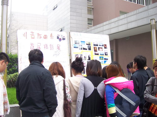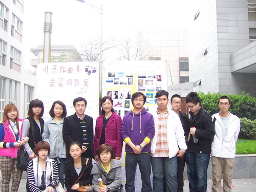 2010年4月12日上午10:00,在教学楼前,作曲系摄影社首届摄影展正式开幕。 在院团委的领导下,及系领导及各位辅导员的号召下,系摄影社筹划举办了首届摄影展。本次摄影展积极向上地反映了学生的生活及思想,胡维亚老师作为指导教师参与了本次摄影展。 团委李天昊书记亲自到场指导,给社团同学极大的鼓励。李书记给予活动极高的评价与支持,他说:“学院需要健康的全面的发展;需要有这样的一群人;需要有这样的摄影社。”同时,李书记也提出了几点希望和建议。 本次摄影展的成功举办,与学院的支持,老师的鼓励,同学们的积极参与是密不可分的,摄影社也欢迎更多的同学加入。作曲系摄影社会不断地发扬壮大下去,以后将定期举办不同主题的摄影活动,记录下学院及同学们的点点滴滴,展示社团活动更多的风采。 川音作曲系摄影社成立于2008年4月,是学院团委领导下的一个崭新的社团组织,主要由大一至大三年级的摄影爱好者组成。社团经过近2年不断发展壮大,现已有社员十多人。社团采取自治管理的方式,本着丰富学生课余生活、提高学生综合能力以及开辟第二课堂为宗旨,在每学期都制定了丰富多彩的活动计划。 社团组织并带领社员积极参与学校各项摄影创作采风活动,增强了团队的凝聚力,使社员在丰富多彩的活动中领略到摄影的魅力,提高了摄影技术,增添了生活的情趣。 作曲系摄影社将在以后继续定期举办各类摄影展览,欢迎各位师生参观指正。
