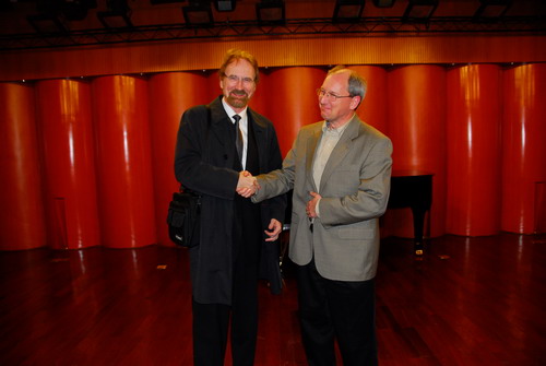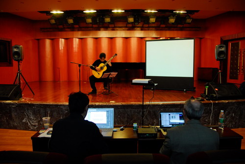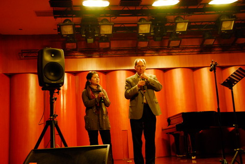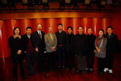 尼尔森教授的作品及其对美国当代电子音乐的诠释给听众留下了深刻的印象。第一首作品《装扮的格里——为单簧管与现场交互式电子音乐而作》以演奏家“格里”的名字命名,是一首典型的人机互动的交互式音乐。由单簧管来决定计算机音乐产生的结果。在作品的演奏过程中,单簧管演奏家会对作品的演奏进行很多随机的选择,而计算机在“倾听”单簧管演奏的过程中,会对演奏的每个片段做出各种响应,实现二者之间的交互。其中的《愤怒之石——为多媒体影像与电子音乐而作》以及《飞翔的想象——为烟火表演与磁带音乐而作》这两部作品均将音乐与视频结合起来,打开了人们的听觉、视觉空间。音与画带给人们无尽的想象,“看得见的声音”在这两部作品中已成为可能。最后一首作品《波的折射——为吉他与磁带音乐而作》展现了高超的写作技巧,进一步挖掘了吉他的声音资源,对吉他演奏者提出了很高的要求,作曲家与演奏者现场完美的配合赢得了师生们的好评。
