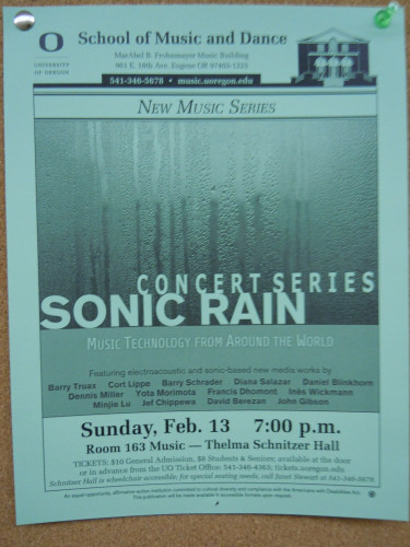 首届Sonic Rain系列音乐会由俄勒冈大学音乐学院主办,向世界各地征集作品,从300多件作品中遴选出12首作品于2月13日晚演出。当晚的作品均为幻听类电子音乐(Acousmatic Music)与多媒体电子音乐,12位作曲者分别来自美国、加拿大、日本、澳大利亚、中国、法国。我系青年教师陆敏捷创作的电子音乐作品《往生极乐——为汶川地震遇难者而作》是此次音乐会唯一入选的中国作品,获得观众的广泛好评。该作品结合佛教文化元素,基于音频技术创作,评委美国电子音乐作曲家Jeffrey Stolet教授对此充分肯定,认为作品深刻感人。 另一场交互式电子音乐会将于2月23日在美国尤金上演。美国当地新闻对Sonic Rain系列音乐会进行了专题报道。