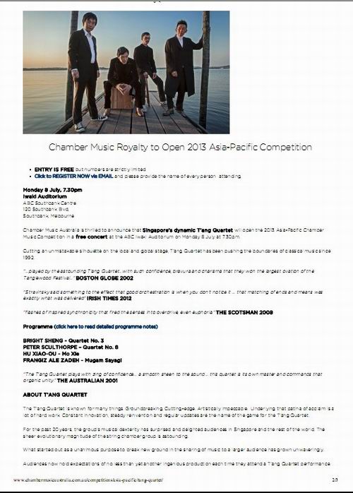 我系教师胡小鸥博士弦乐四重奏《麽些》作为亚太室内乐国际比赛开场曲目在澳大利亚墨尔本演出。 近期在澳大利亚墨尔本举行的亚太室内乐国际比赛吸引了国际上多支活跃的室内乐团参赛。蛮声世界的新加坡唐四重奏作为特邀演出乐团在开幕式演奏了四部风格迥异的作品,其中包括美籍华裔作曲家盛宗亮的第三弦乐四重奏,澳大利亚作曲家斯柯尔索普的第八弦乐四重奏,我系教师胡小鸥的《麽些》,阿塞拜疆作曲家FRANGIZ ALE ZADEH的Mugam Sayagi. 胡小鸥老师的《麽些》获得了澳洲媒体的高度赞扬,被称为“能引起澳大利亚共鸣的作品,音乐充满激情和冲击力。”《麽些》创作于2004年,获得过UMKC室内乐作曲比赛第一名和2006年美国SCI中西部委约作曲比赛第一名。 作曲系 2013年9月4日