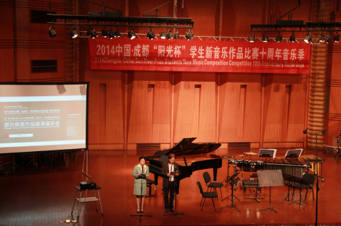 音乐会开始之前,第十届(2014)“阳光杯”学生新音乐作品比赛评委会主席何训田教授代表本届评委会宣布了2014中国•成都“阳光杯”学生新音乐作品比赛的获奖学生名单。本届赛事共收到来自中国、中国香港、美国、英国、德国、俄罗斯、韩国、希腊、巴西、斯洛文尼亚、克罗地亚、以色列等不同国家和地区的71部参赛作品。通过评委会三轮认真评选,最终6部作品获等次将并颁发证书与奖金,6部作品获作品奖并颁发证书。