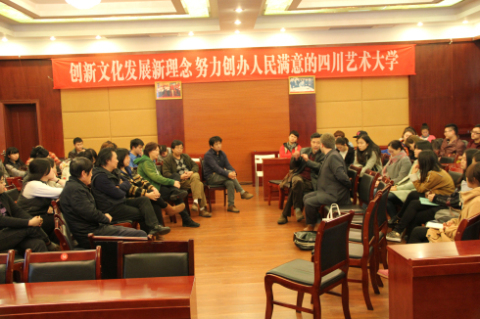 正值校庆七十五周年之际,我系邀请到了来自英国伯明翰音乐学院的卡特勒尔教授客座川音。11月22日上午,乔给我们带来了一场精彩纷呈的演讲,他与他的“舒适的音乐”给大家留下了深刻的印象。下午,乔将和师生们再次相约在梧桐楼,来一场热情的思维碰撞。 乔•卡特勒尔教授自2005年以来开始担任英国伯明翰音乐学院作曲系的系主任,是这个被誉为欧洲领先的作曲系在艺术上的领军人物。22日下午,师生们都带上了各自的作品,以音频和谱面的形式轮流向乔展示。展示完之后,乔仔细分析了每一部作品,提出了自己的观点。随后,乔又邀请大家提出问题,一起自由讨论,提出了作品相关的修改建议。每位老师都和乔热情的交流、探讨,围坐在一圈,享受创作音乐带来的乐趣。 愉快的时光总是过得很快,和乔在一起的短短一天就快要结束了,大家一起在会场合影,留下彼此的联系方式,握手寒暄道别,期待着下一次的重逢。 李逸 2014年11月26日