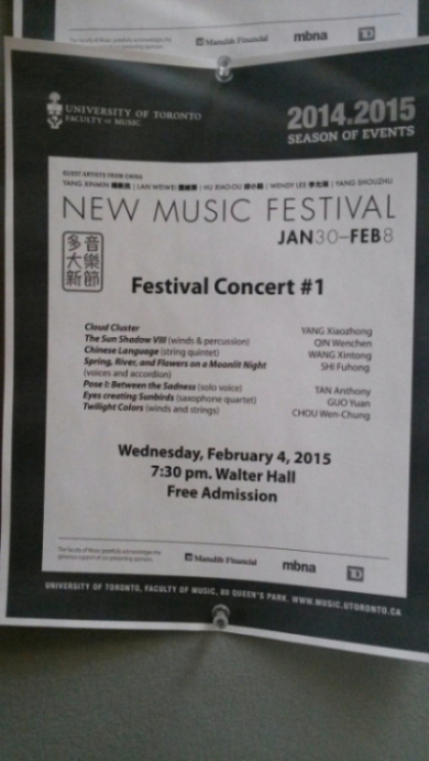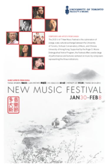 2015加拿大多伦多大学新音乐节于2015年1月30日至2月8号在加拿大多伦多大学音乐学院举行。本次音乐节是整个多伦多大学音乐学院与beat365在线唯一官网、香港中文大学联合学术交流项目的最后一站,也是整个音乐文化交流活动的最高潮。