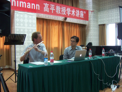 2015年5月25日至26日,由作曲系、作曲技术研究中心主办的,亚太作曲家长笛与钢琴专场音乐会与学术讲座在我院如期举行。25日上午的学术讲座分为两场,第一场是由瑞士籍长笛演奏家、室内乐音乐家、作曲家Markus Broennimann主讲的名为《作曲家怎样为长笛写作》的学术讲座。Markus分别以以CPE 巴赫、德彪西、瓦雷兹、武满彻、霍利格尔为例,讲解了这些作曲家在为长笛创作时所表现出的特有的创作风格。从CPE 巴赫多线条、多声概念的运用,突出不同音域对比的长笛作品;到德彪西的乐队式的、田园风格的长笛作品;再到瓦雷兹使用特殊演奏法、音域宽广的长笛作品。Markus用先讲解后演奏的方式,让大家清晰,直接的聆听到了几位作曲大师的优秀长笛作品。之后Markus又从泛音、打键、花舌、微分音、同音颤音、哨音、长笛与人声等11种现代长笛作品中演奏技法和音色入手,为大家现场展示了长笛演奏中的无限可能性与困难之处。为大家在长笛写作方面,上了一堂生动、实用的课程。第二场是由作曲家、钢琴家高平主讲的名为《“我的近期写作--来自‘四不像’的联想》的学术讲座。高平先生以作品名“四不像”的由来开始,讲解了《四不像》这部为多功能钢琴家与民族乐团而作的作品。首先从写作背景、作品特点、主题结构三个方面大体的为大家勾勒出了这部作品的创作思路。而后又分别从作品的三个乐章入手,详细的讲述了每个乐章的风格特点与表现形式,体现了高平先生多元化的创作风格和理念。
