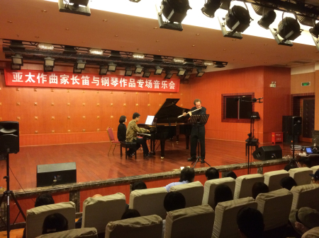 在26日下午的亚太作曲家长笛与钢琴专场音乐会中,七部优秀的作品,它们是《歌》细川俊夫、《翱翔于无极之野》贾国平、《奏鸣曲-春花之舞》高为杰、《夜巷》高平、《十二小时之桥》高平、《五首前奏曲-为独奏长笛而作》Markus Broennimann、《雨林》Jack Body,再加上Markus与高平先生的精湛演奏,博得了现场听众的阵阵掌声。短短两天时间,两场学术讲座一场音乐会,在高密度的学术盛宴熏陶下,希望作曲学习者能够从中获得收获和启发。
