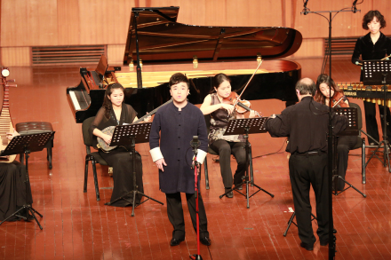 音乐会的后半场上演了三位评委的作品,分别是林戈尔教授的钢琴独奏《峨眉晚钟》、陈怡博士的长笛与钢琴《西南小曲三首》以及高为杰教授为独唱、琵琶、三弦、颤音琴与弦乐五重奏而作的《元曲小唱(三首)》。