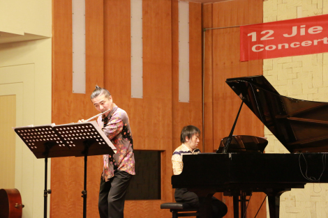 音乐会最后上演的是黄旭副教授的《山歌对唱》。山歌是中国民歌的一种,其旋律特点:音调高亢有力,节奏长短不一,气息灵活多变。在这首作品中,我们可以听到其作品擅长表达多变的情绪与缤纷的色彩,重视对音效的艺术化夸张,强调对素材的逻辑运用与充分地感性发挥。