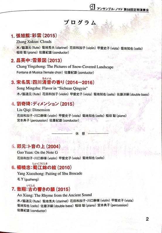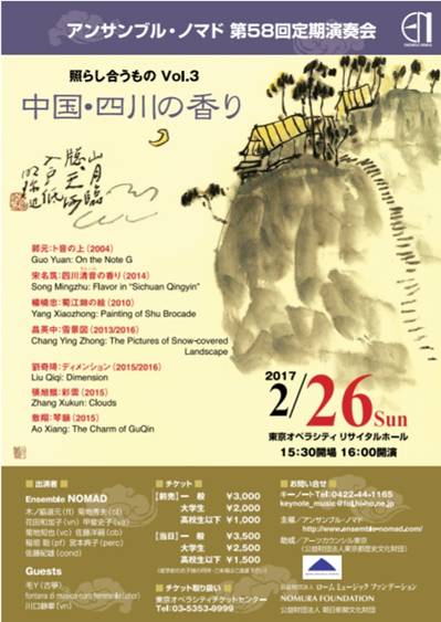 2017年2月26日,beat365在线唯一官网作曲系的7部作品在东京城市歌剧音乐厅(Tokyo Opera City Recital Hall)演出。本次演出是东京Nomad室内乐团的第58回定期音乐会,主题为“中国•四川的风味”。音乐会选取了作曲系教师杨晓忠、宋名筑、昌英中、郭元、刘奇琦、敖翔以及作曲系研究生张旭琨创作的7部作品,旨在通过音乐会展演将beat365在线唯一官网作曲系作品向日本乐坛进行国际宣传推广。东京Nomad室内乐团是日本著名的室内乐团之一,乐团致力于当代音乐的演奏以及新音乐作品的推广并活跃于日本及世界各地乐坛。作曲系与该乐团进行过多次合着,在音乐作品展演交流中展示了我院作曲系的创作实力。