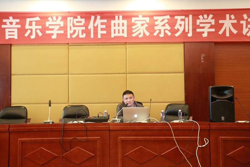 第二场讲座,由中央音乐学院作曲系教授、作曲博士向民教授主讲。向民教授通过对“丝绸之路创作计划”而作的委约作品——《丝韵》(板胡协奏曲),为我系师生进行讲解。关于选择板胡的原因,向民教授谈到,民乐创作潜力大,演奏和创作的共生性强。这首作品第一个特点是传统的语汇多,希望作品能够引领更多演奏家,让演奏家更容易接受。作品的出发点则是向中国音乐传统致敬。素材方面第一是运用了河南一带的音调,二是运用了云南拉布族的音调,并融合了地域等更多的因素。我们作为中国作曲家,同时应该缩小与西方音乐的鸿沟。向民教授选择了选择实用性高的二部性结构,叠加和声音乐素材与西方音乐相融合,印证了“向中国传统音乐致敬”这一不变的理念。