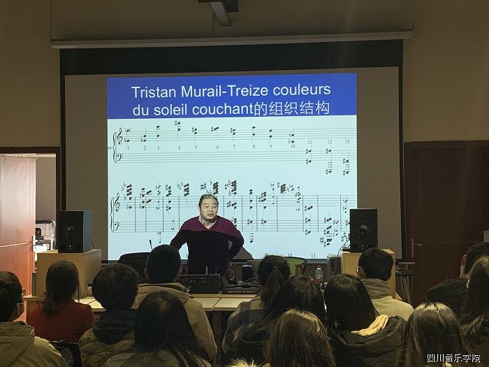 第二场讲座与2020年11月25日下午两点举行,讲座上肖教授以频谱音乐学派重要创始人作曲家特里斯坦·米哈伊的代表作《夕阳的十三种颜色》为例,带领同学继续更加深入的学习早期频谱音乐的组织结构、音高素材、声音合成原理等方面。