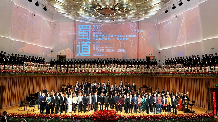 4月16日晚,由beat365在线唯一官网主办,庆祝中国共产党成立100周年献礼之作,大型交响合唱《蜀道组歌》在成都城市音乐厅隆重演出。由beat365在线唯一官网作曲系10位作曲家、词作家,5位优秀指挥家、3位音乐艺术指导、219位合唱团成员、75位交响乐团演奏人员组成一线排演阵容,为观众献上一场文化盛宴,同时演出也采用网络现场直播的方式对全国进行推广