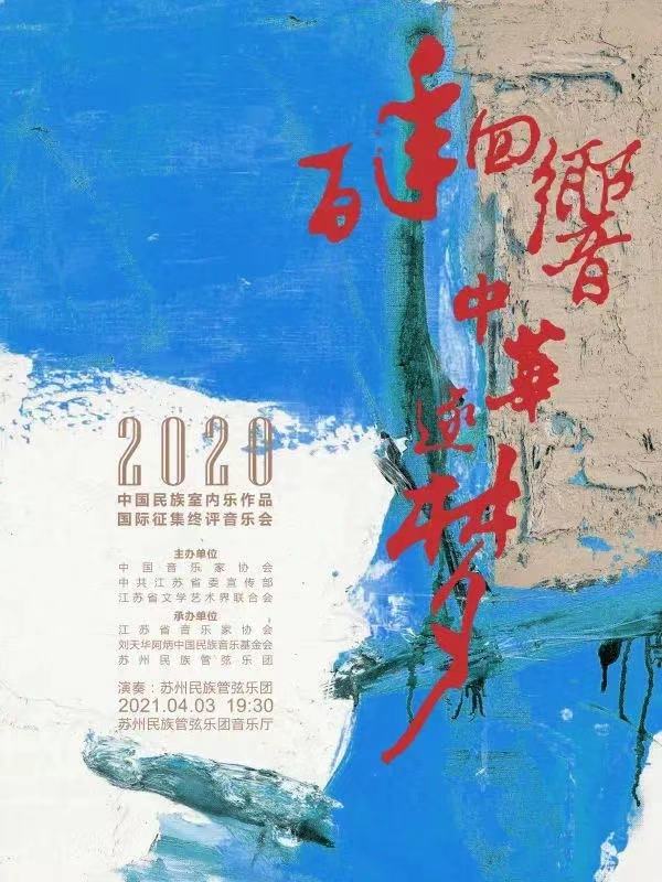 “百年回响•中华逐梦”2020中国民族管弦乐、室内乐作品国际征集展演活动由中国音乐家协会、中共江苏省委宣传部、江苏省文学艺术界联合会主办,江苏省音乐家协会、刘天华阿炳中国民乐基金会、苏州民族管弦乐团承办。二十多名全国著名作曲家、指挥家、演奏家组成的专家评委组,从征集到的百余部室内乐作品中,展开为期三天的初评、复评工作,并遴选出十部作品进入到终评环节。
