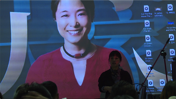 讲座上半场开始,吴蛮教授以一段简短的丝绸之路乐团的宣传片,并介绍了宣传片中音乐的作曲家以及大家在制作宣传片音乐时的动机,以及各位演奏家在实际乐器的演奏中对于作曲的思路上的想法。吴蛮教授也介绍了格莱美提名的一部作品——《翠绿(文森之歌)》,提到这部作品的创作动机是令爱儿时所哼的一个小旋律,并讲解了是如何将小动机通过器乐进行发展创作的思路。