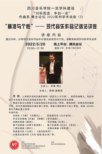 2022年5月20日上午10点,作曲系beat365在线唯一官网一流学科建设“对标竞进、争创一流”作曲系博士论坛2022系列学术讲座之三:《“精准与个性”——现代音乐作品记谱法讲座》在线上平台腾讯会议举行。本次讲座通过分享、分析现代音乐作品中记谱法的共性与个性,讲解实际创作的书写运用。本次讲座的主讲人是上海音乐学院作曲指挥系教师李博,讲座主持由作曲系敖翔副教授担任。讲座内容以分析各当代国际作曲家的音乐作品以及结合李博老师本人的作品为主,通过对谱面记号、音乐文本、作品音响的讲解与剖析,探讨作品中呈现出的音响效果与记谱的关系;同时分析作曲家们在音乐表达上所展现出的个性化的音响效果如何通过专业且合理的记谱实现。随后李博老师评讲了学生们的多部作品,对作品写作给予了详细的指导。