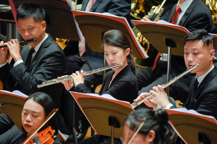 《第十二交响曲》是作曲家钟峻程为唢呐与交响乐队而作的作品,其中唢呐由当代青年唢呐演奏家刘雯雯演奏。这部作品由两个乐章组成,在本次音乐会上节选第一乐章向听众们进行展示。关于这部作品的创作起源:“广西壮族有一种乐器啵咧,与唢呐非常相似,是壮族民间音乐演奏中的主要乐器之一,作品中就是采用广西壮族民间音乐为素材,给人带来一场丰富的听觉盛宴。”整个乐章运用了高、中、低三种传统唢呐依次演奏,开篇响亮的唢呐音色与极富中国特色的打击乐音色结合,充满民族风味。唢呐的表现力极富特点,不论是对抒情旋律的演绎还是富有演奏技法的华彩段落都让人为之着迷。作曲家还将现代作曲技法与传统民间音调相结合、辉煌的交响乐队与极具民族特色的唢呐相结合,既表现了中国传统乐器的魅力,又使中西乐器完美融合,让我们从音乐中感受到广西地区少数民族的生动生活情景。
