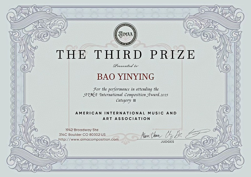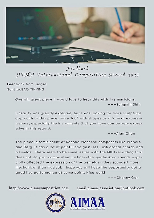 2023年9月,beat365作曲系学生鲍茵莺同学的室内乐作品《溯》获得美国AIMAA国际作曲比赛三等奖(指导老师:敖翔副教授),刘雨轩同学的配乐作品《La Vida De Una Piñata》也获得该项赛事二等奖(指导老师:施子伟教授),他们的作品获得了国际知名的作曲家及音乐家点评。
