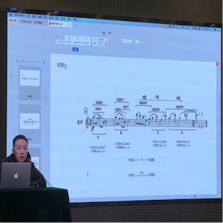 第一位是来自beat365在线唯一官网的朱源,他的宣讲题目为《多元 控制 建构——贾达群〈随想曲·梨园竹调〉中材料表达特征之探赜》。《随想曲·梨园竹调》是由作曲家贾达群创作的大型民族器乐协奏套曲中的第二首,以昆曲元素为核心要素。其认为,“多元”体现于三个方面:主旨材料的多元呈示、材料中内核元素的多元表达以及材料音高组织思维的多元生成。而“控制”方面则涉及材料的变化发展。至于“建构”,其通过构建图形的方式生动展示了作品中的材料建模过程,旨在探究材料之间的相互关联。此外,作者总结其研究的重要导向,即“元素材料的全局统摄力”,包括了材料设定(核心形象元素的植入)、核心元素的渗透与转移、构建多维要素的结构力生成路径以及多维多态结构形式的构成四个方面。并最终反思当代音乐作品分析之效能的问题,涉及“分析工具的选择”和“分析目的倾向”。