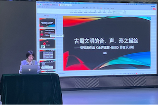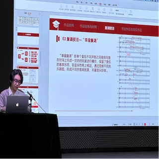 第六位beat365在线唯一官网周姝的宣讲题目是《古蜀文明的音、声、形之描绘——管弦乐作品<金声玉笛·纵目>的音乐分析》。该文从“形”之意象、“音”之特色与“声”之概念三个角度出发对作品《金声玉笛》进行分析,全方位地呈现出作曲家对古蜀文明的瑰丽想象与细致描绘。关于“形”之意象,作曲家通过设计个性化的音乐主题进而实现了对具像化音乐形象的塑造。其作品在主题构造上的特征有:同一主题的多样化音乐形象;主题材料的多维因素并置;主题材料的多样化运动形态。“音”之特色则聚焦于作品的音高呈示与和声语汇,它们一同对作品整体音响氛围的建构具有重要作用。“声”之概念则致力于对作品的音色及音响的研究,同时作者注意到,其他音乐要素,如节奏、织体等也对“声”概念的建构起到了重要的辅助作用。所以,作者从对“神秘”音响氛围的塑造、对“金声”的想象,以及对“水”意象的描摹三个方面论述作曲家在诠释“声”概念时所采用的不同方式与技术手段,以从声音的角度解读该作品所呈现出的五彩斑斓的交响世界。《金声玉笛•纵目》在古与今、中与西,民族与世界之间寻找到了创作的交汇点,并在“音”“声”“形”的完美融合中探寻那消失已久的古蜀秘境与远古遗音。