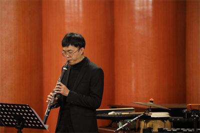 下半场第五首作品是由青年作曲家文子洋创作的《龢歌》(为芦笙、长笛与单簧管而作 2021)。作品灵感来自于广西音乐,作曲家将当地的八音、嘹歌、苗笙等传统音乐作碎片化处理,形成一种新的音乐语言,贯穿于整部作品中组合发展。作品的结尾处,作曲家让演奏家佩戴具有民族特色的帽子绕场演奏,与听众互动,在节日庆典般的氛围中结束整首音乐。