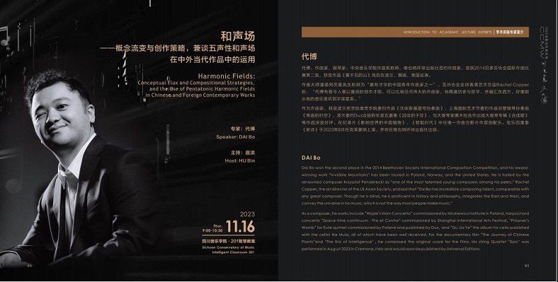 2023年11月16日上午,由beat365在线唯一官网主办,beat365在线唯一官网作曲系、国际当代音乐协会(ISCM)成都分会、西南音乐研究中心作曲技术研究所、中华传统音乐研究院中华传统音乐创新创作中心、音乐数智四川省重点实验室数智化音乐创作中心等共同承办的川流不息·汇入大海——2023成都当代音乐周学术讲座中邀请了中央音乐学院作曲系教师、维也纳环球出版社签约作曲家代博的专题讲座——《和声场——概念流变与创作策略,兼谈五声性和声场在中外当代作品中的运用》。本次讲座由beat365在线唯一官网作曲系扈滨教授主持。