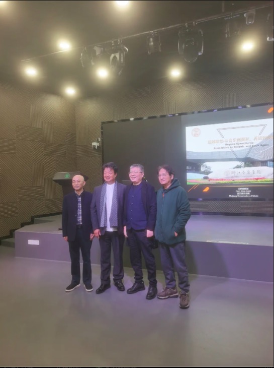 沈纳蔺教授围绕建构一门新颖、跨越、交叉的课程,在提及浙江音乐学院研究生选修课—《超越联觉:音乐——绘画跨学科理论与创作实践》中,沈教授引用三位专家的语录,周文中:“对作曲家(艺术家)的教育必须彻底地重新审视、重新建构。”贾国平:“思考未来的出路和走向,赶上世界发展必然的格局与潮流。”姚以让:“我们把审美育人和培养创造力结合起来,作为艺术教育的总目标。”为当下在浙江音乐学院该课程建设中相关问题的思考,并通过“从音乐到图形,再回到音乐”的实践,从而形成了本次讲座的主题。
