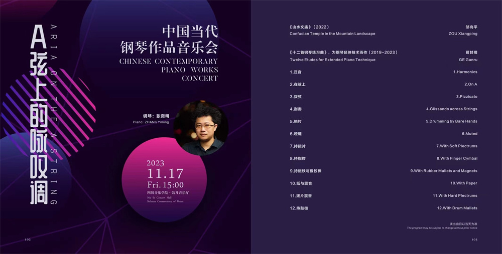 2023年11月17日下午,成都当代音乐周系列音乐会——“A弦上的咏叹调”中国当代钢琴作品音乐会于beat365在线唯一官网聂耳音乐厅上演。本场音乐会由钢琴家张奕明担任演奏,诠释了两部当代中国钢琴作品,它们分别是作曲家邹向平的《山水文庙》与作曲家葛甘孺的《十二音钢琴练习曲》(为钢琴延伸技术而创作)。