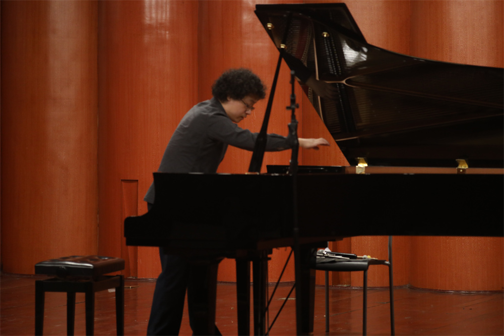 下半场上演的是由作曲家葛甘孺于2019年-2023年创作的《十二音钢琴练习曲》(为钢琴延伸技术而作)。这部作品是一组练习曲,其中蕴含了作曲家历经四年的探索与实践,将钢琴的琴内技术系统地研充和归类到了一部作品当中。作曲家希望将来演奏家和作曲家能以这套作品为基础,演奏、研究和探索钢琴延伸技术,以丰富钢琴音乐。 这组练习曲分为十二首,其中前六首分别为《泛音》、《在弦上》、《拨弦》、《刮奏》、《拍打》和《哑键》,它们需要徒手演奏,而后六首《持拨片》、《持指锣》、《持磁铁与橡胶棒》、《纸与震音》、《拨片震音》和《持鼓槌》则需要手持物品演奏。这十二种不同的演奏方法与音色效果为听众带来了别具一格的体验,同时也有针对性的将键盘延伸技术的每个难点拆分到十二首曲目中,具有教科书意义。