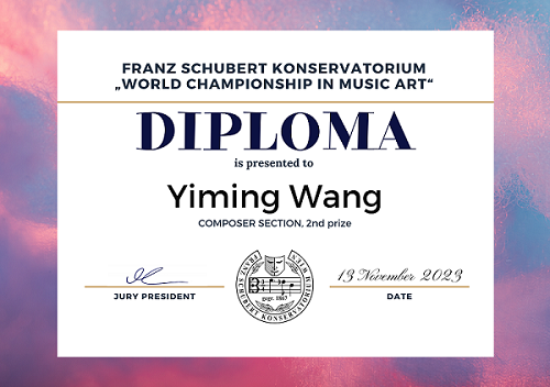 2023年11月,在维也纳举办的2023世界艺术锦标赛中,经过众多国际选手的激烈角逐,我院作曲系2022级同学王一鸣凭借作品《Rhythmic cycle》以91.5的高分荣获独奏作品组二等奖,《Winding road》荣获三等奖(指导教师:郭龙教授)。2022级同学黄婷凭借两部作品《Rhythmic swing》与《On D For Clarinet In B ♭》均获该项赛事独奏作品组三等奖(指导教师:郭龙教授)。